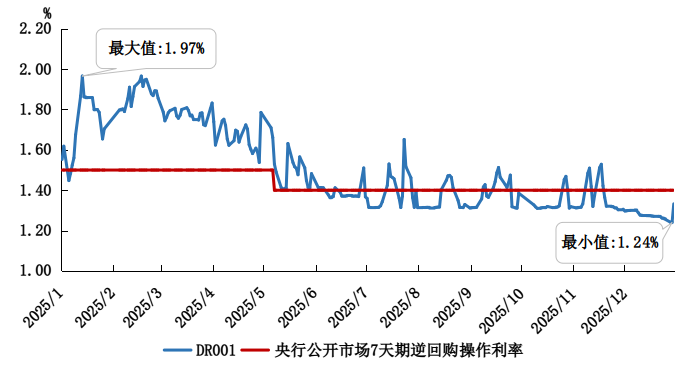 2025年,银行业存款类金融机构间利率债隔夜质押式回购(DR001)年加权平均利率为1.46%,较2024年下降19个基点;DR007年加权平均利率为1.63%,较2024年下降19个基点;银行间市场隔夜质押式回购(R001)年加权平均利率为1.55%,较2024年下降21个基点。2025年,DR001与央行公开市场7天期逆回购操作利率的利差日均值为7个基点,R001与DR001的利差日均值为8个基点。